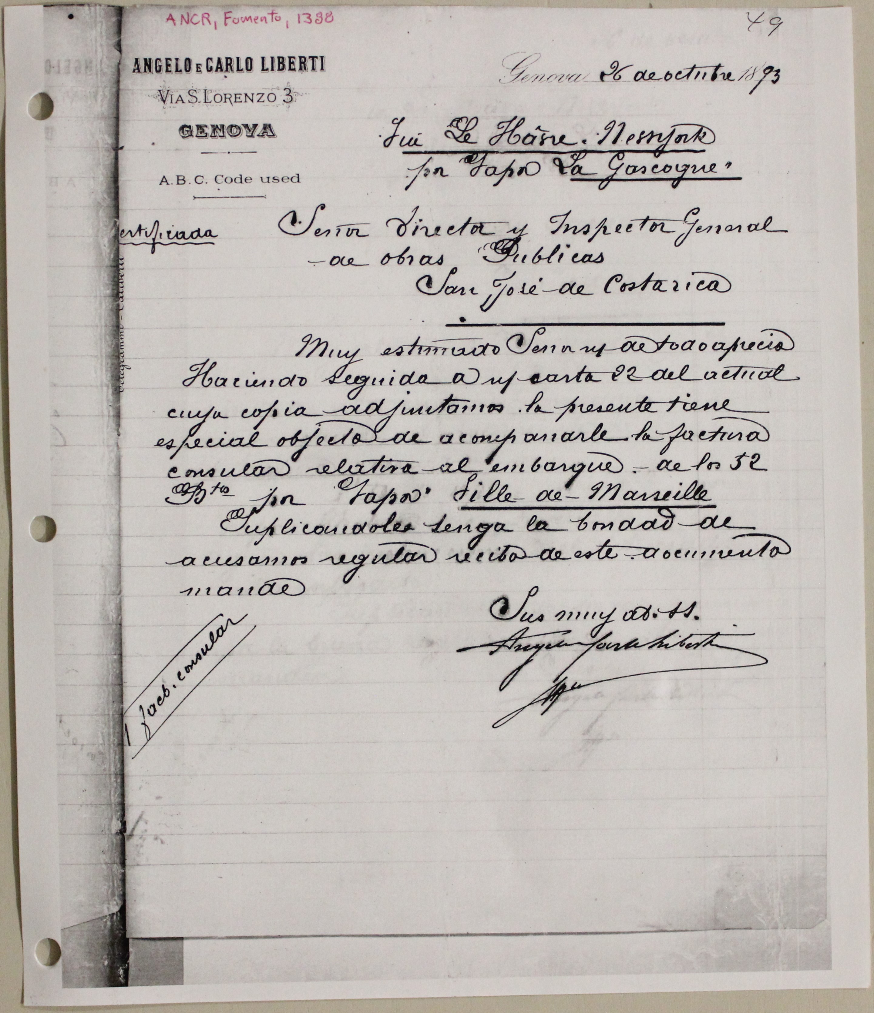 | dc.description | Fotografía de fotocopia de carta realizada el 26 de octubre de 1893 en Genova, Italia. | |