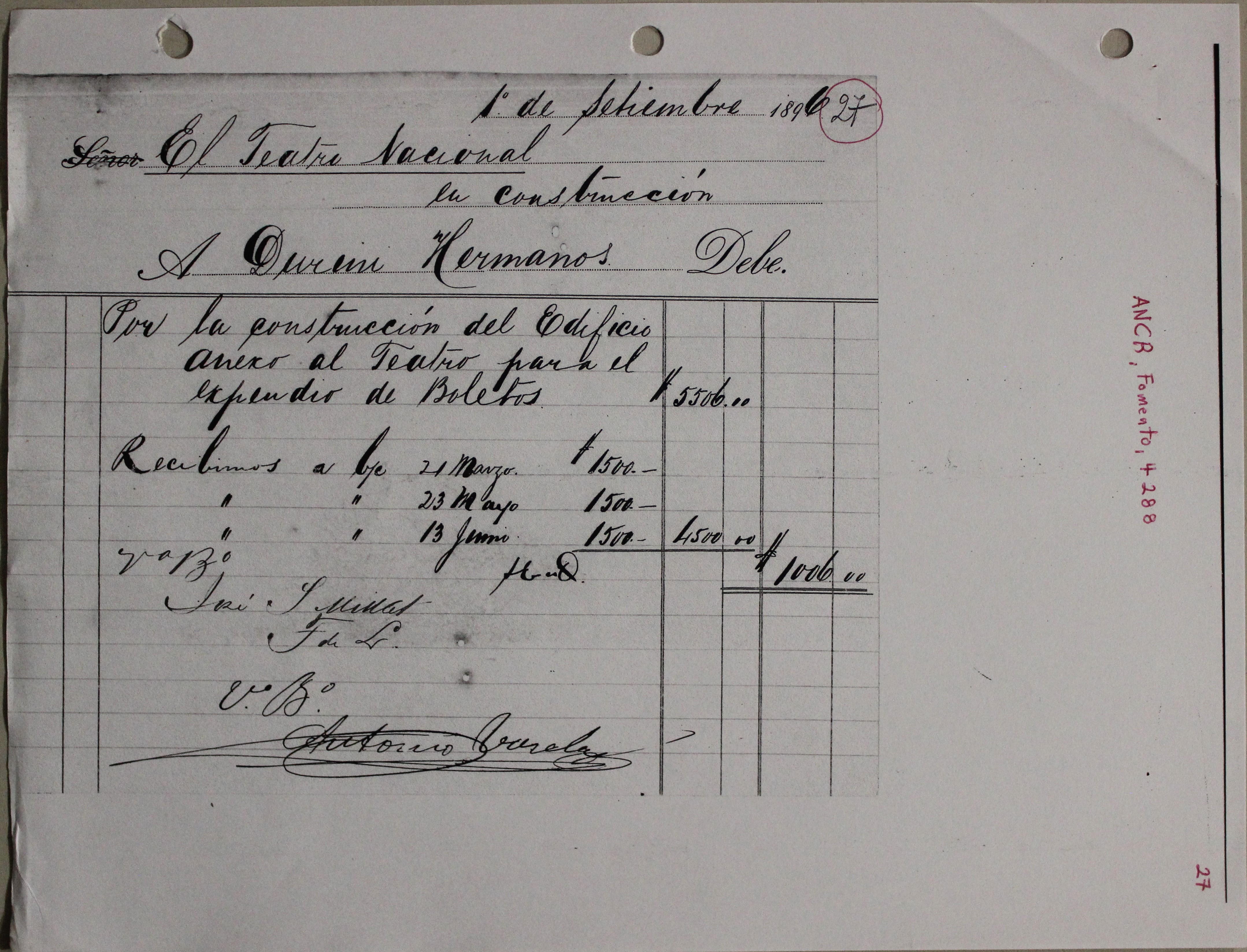 | dc.description | Fotografía de fotocopia de factura creada por el Teatro Nacional en construcción el 1 de setiembre de 1896 a Durini Hermanos. | |