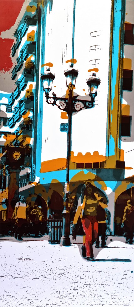 Instantes urbanos Esta muestra de arte urbano responde directamente a mi cotidiana percepción del contexto urbano, centro mi interés en cómo vivimos el espacio urbano, por un lado, con cierto orden o con un plan discretamente efectivo y por otro, arrastrando un crecimiento desordenado, caótico y a la libre. Podrían estas imágenes plasmar escenas opacas y tristes, pero es mi elección, a pesar de encontrarme en un vaivén de gustos y disgustos, reflejar en ellas una atmósfera positiva y que propicie la visión de que, a pesar de la actual San José, la sigo viviendo con encanto y enganchado a la dinámica del transeúnte. En este ecosistema urbano, las obras toman como punto de partida dos ejes: el individuo y la infraestructura, y cómo su interrelación va creando paisajes con muchas capas; en ocasiones saturadas de elementos y otras veces, siluetas que reflejan las dinámicas de las personas que conviven en esta muchedumbre. Entre lo local, regional y global. Si bien en muchas de las obras expuestas el motivo representado es nuestra San José, en otras he partido de imágenes capturadas en distintas ciudades, ya que, bajo mi óptica, los centros urbanos comparten las mismas dinámicas sociales y al final somos gente viviendo en un espacio común. Es evidente y no podemos obviar que algunas ciudades han sido creadas, conformadas y desarrolladas en óptimas condiciones para que funcionen de buena manera; sin embargo, me niego a dejar de disfrutar la urbe en que me tocó nacer, la cual, a pesar de que huele a meados, es la musa de esta exposición. Gráfica y escultura. Fiel a mi formación, la muestra imprime su color por medio de obras gráficas (serigrafías) y juega con el volumen y la materialidad de la escultura; además, considero que el vínculo entre el motivo representado y las técnicas escogidas nos hablan de las múltiples capas de significado que revela nuestra relación con la ciudad, la serialización de los elementos y las sensaciones otorgadas por los diferentes materiales. Instantes urbanos cuenta las historias de los individuos que capturo en su cotidiano vivir, busco transmitir sus experiencias en el entorno citadino. Sebastián Mello Salaberry. 2024.