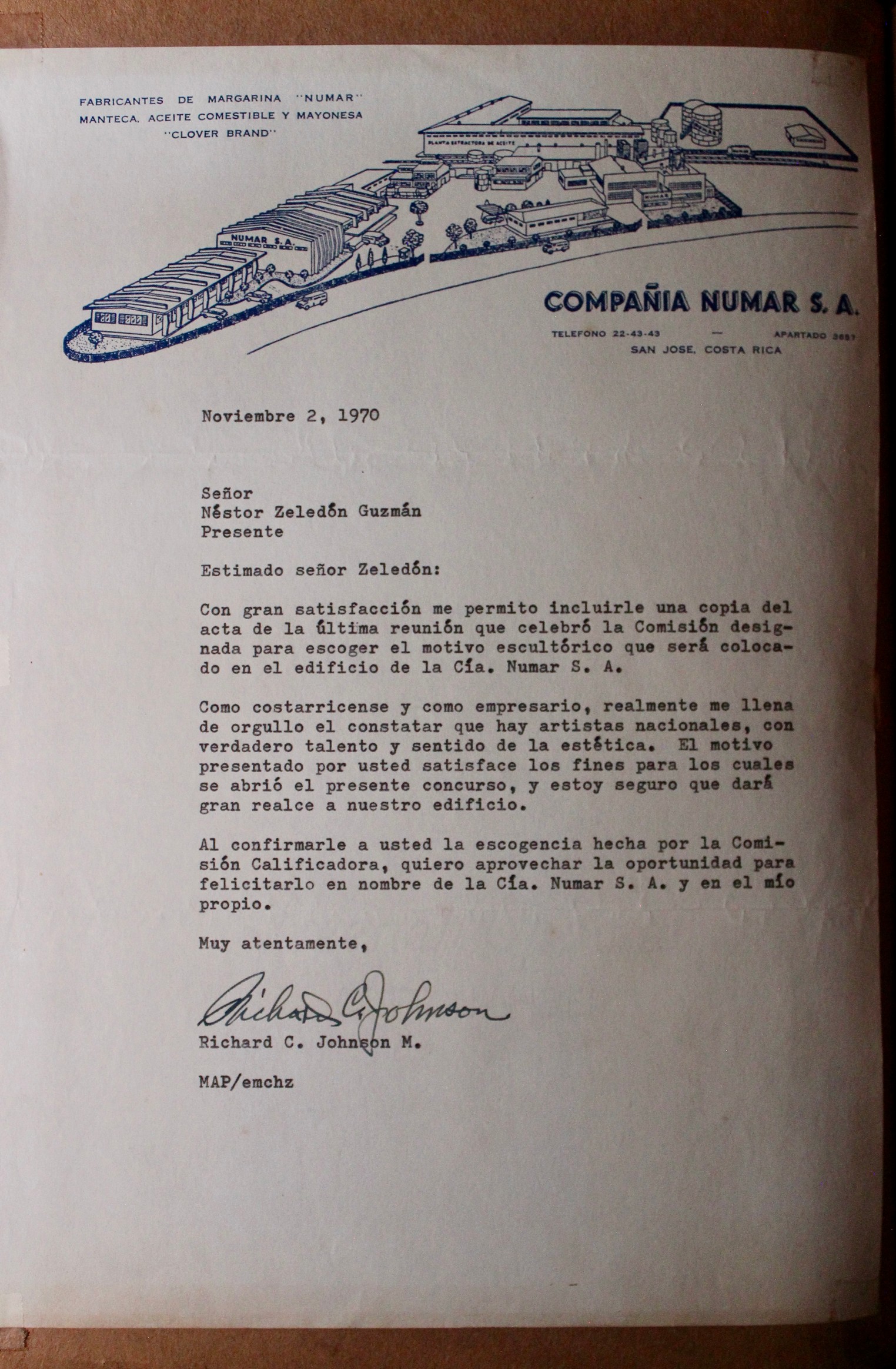 | dc.description | Carta en la que se le informa a Néstor que su motivo escultórico, Los Amantes, fue escogida por La Numar. | |