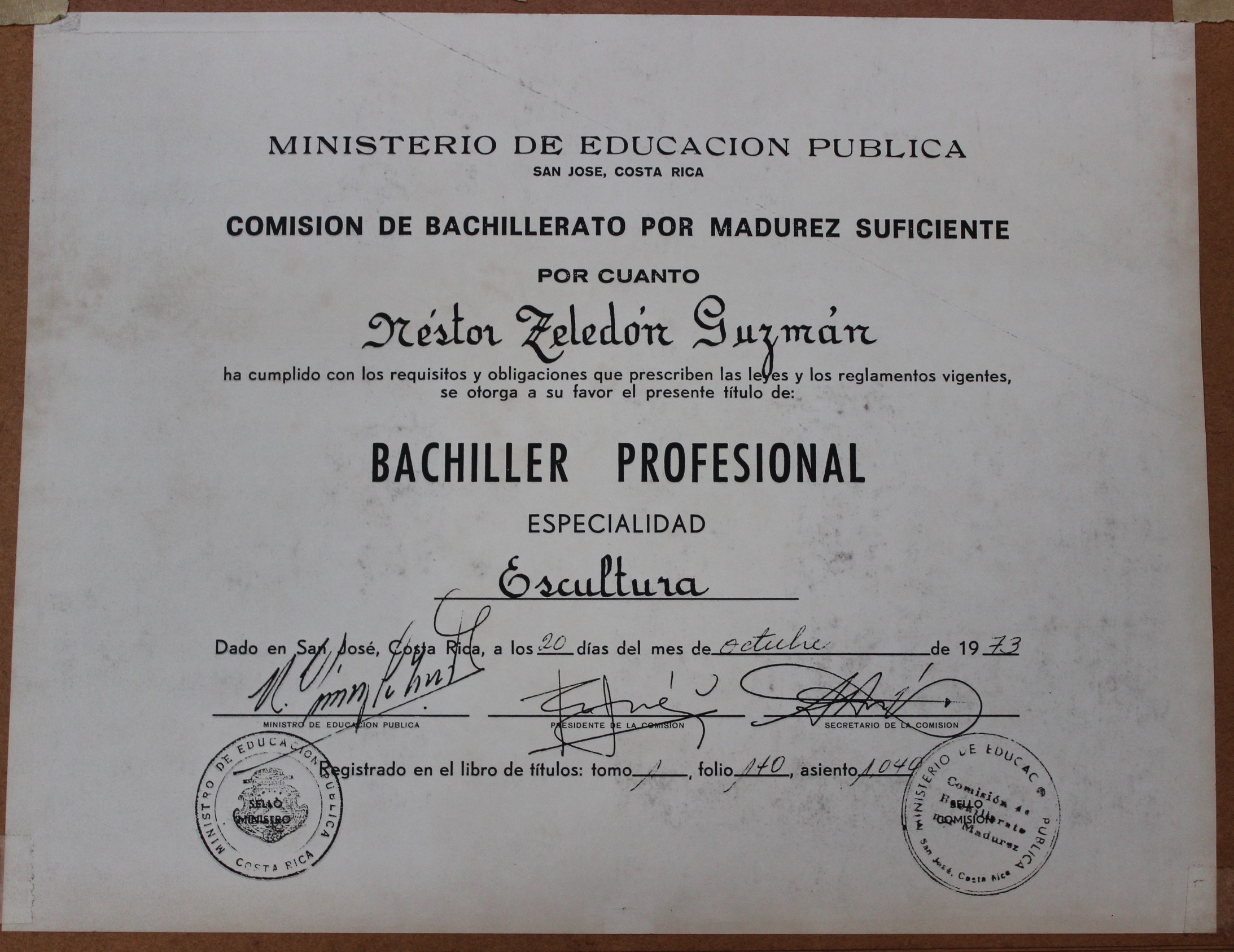 | dc.description | Certificado de Bachillerato Profesional por Madurez especialidad Escultura de Néstor Zeledón Guzmán. | |