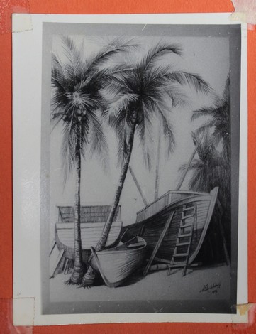 | dc.description | Fotografía de un dibujo realizado por el artista Néstor Zeledón, representando tres barcos y varias palmeras en la playa. | |