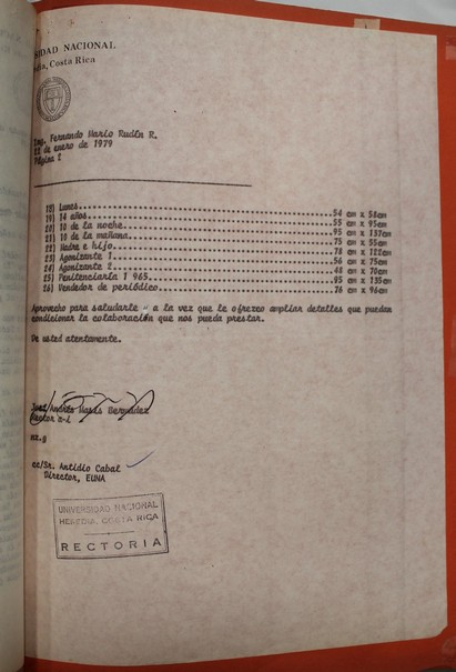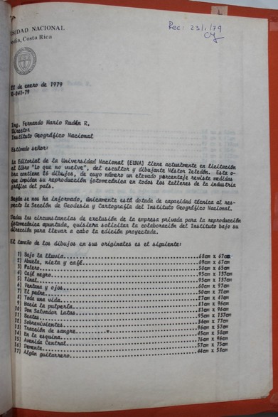 | dc.description | Carta de parte de José Andrés Masís Bermúdez, rector de la UNA, dirigida al Ing. fernando mario Rudén R., Director del Instituto Geográfico Nacional, solicitándole la colaboración de este Instituto para la impresión de una serie de dibujos realizados por el artista Néstor Zeledón para el libro "Lo que no vuelve" ya que no pueden ser impresos en nigún otro equipo. | |