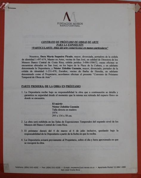 | dc.description | Contrato de préstamo de obras de arte para la exposición "Particularte: Hitos del arte costarricense en manos particulares". Este se envía de parte de la directora de los Museos del Banco Central, Dora María Sequeira Picado y se detallan la información de la obra que estaría en préstamo (El Mártir), las responsabilidades, del estado y restauración de la obra, la utilización de la obra, la museografía y la devolución de la obra. El contrato fue firmado por ambas partes. | |