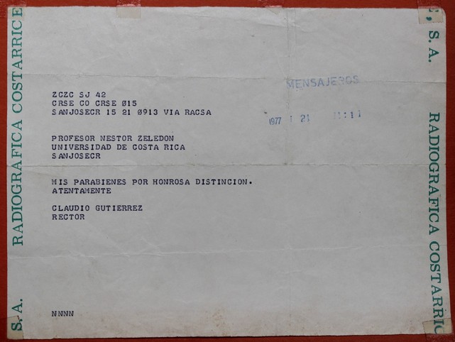 | dc.description | Mensaje radiográfico para Néstor Zeledón, de parte de Claudio Gutiérrez (entonces Rector de la UCR), felicitándolo por la obtención del Premio Nacional de Cultura. | |