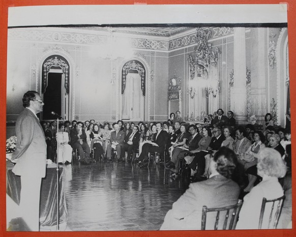 | dc.description | Fotografía en blanco y negro de la ceremonia de entrega de los Premios Nacionales de Cultura 1976, en el foyer del Teatro Nacional. | |