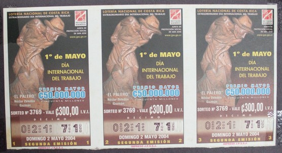 | dc.description | Tres boletos de loteria nacional en conmemoración del Día Internacional del Trabajo con fotografía de la escultura de Néstor Zeledón El palero. | |