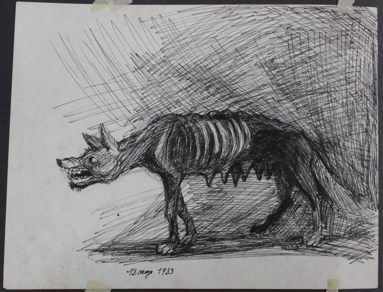 | dc.description | Dibujo de perra desnutrida y molesta en tinta negra. | |