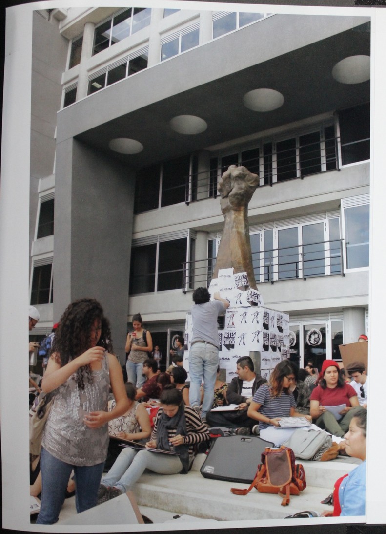 Grupo de personas boceteando "Yo protesto" en Facultad de Ciencias Sociales