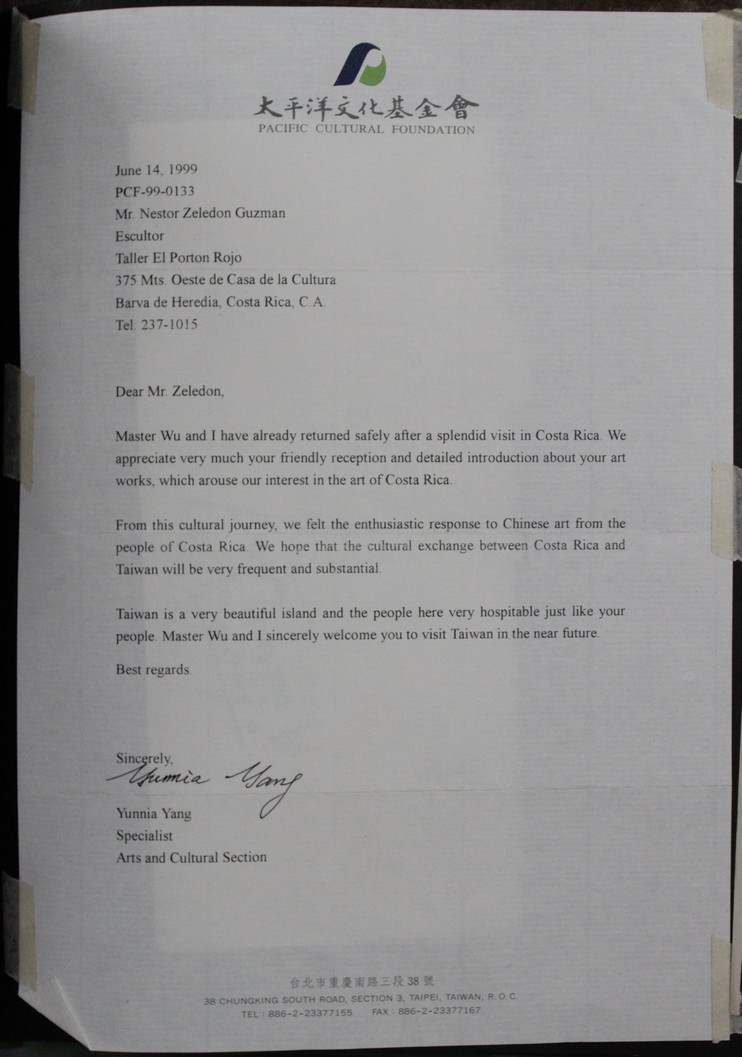 | dc.description | Carta de parte de Yunnia Yang del Pacific Cultural Foundation, para Néstor Zeledón, en la que le agradece por su recepción en Costa Rica, así como la introducción que les hizo al arte costarricense; menciona también que espera pueda gestionarse una colaboración artística entre Taiwan y Costa Rica. Se incluye el sobre en el cual venía la carta. | |