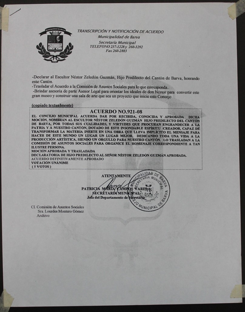| dc.description | Notificación del acuerdo de la Municipalidad de Barva en la que se nombra al escultor Néstor Zeledón hijo predilecto del cantón de Barva de Heredia. | |