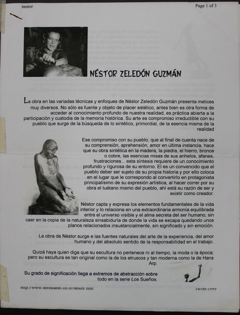 | dc.description | Impresión de un sitio web en el que se elabora una detallada biografía y análisis del estilo del artista Néstor Zeledón. | |