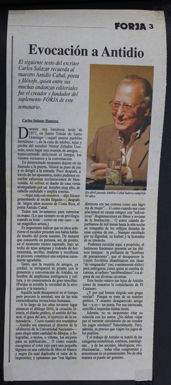 | dc.description | Nota publicada en el suplemento Forja del Semanario Universidad, redactado por Carlos Salazar Ramírez, quien rrecuerda al maestro, poeta y filósofo Antidio Cabal. | |