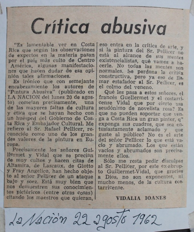 | dc.description | Nota publicada en el periódico La Nación, en la que se defiende al pintor Rafael Pellicer ante una crítica realizada por Guillermet-Vidal y se les critica directamente a ellos. | |