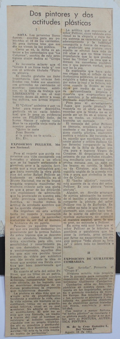 | dc.description | Nota redactada por el artista del Grupo 8, Manuel de la Cruz González comentando las exposiciones de Rafael Pellicer en el Museo Nacional y la exposición de Guillermo Combariza. | |