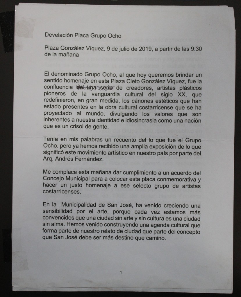 | dc.description | Discurso realizado para la develación de la Placa Grupo Ocho en la Plaza González Víquez. El documento tiene algunas anotaciones. | |