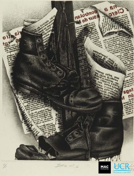 | dc.description | Sobre un periódico con titulares en letras rojas, cuelgan de una tabla, unas botas deterioradas que dejan caer gruesas gotas de un líquido negro. | es |