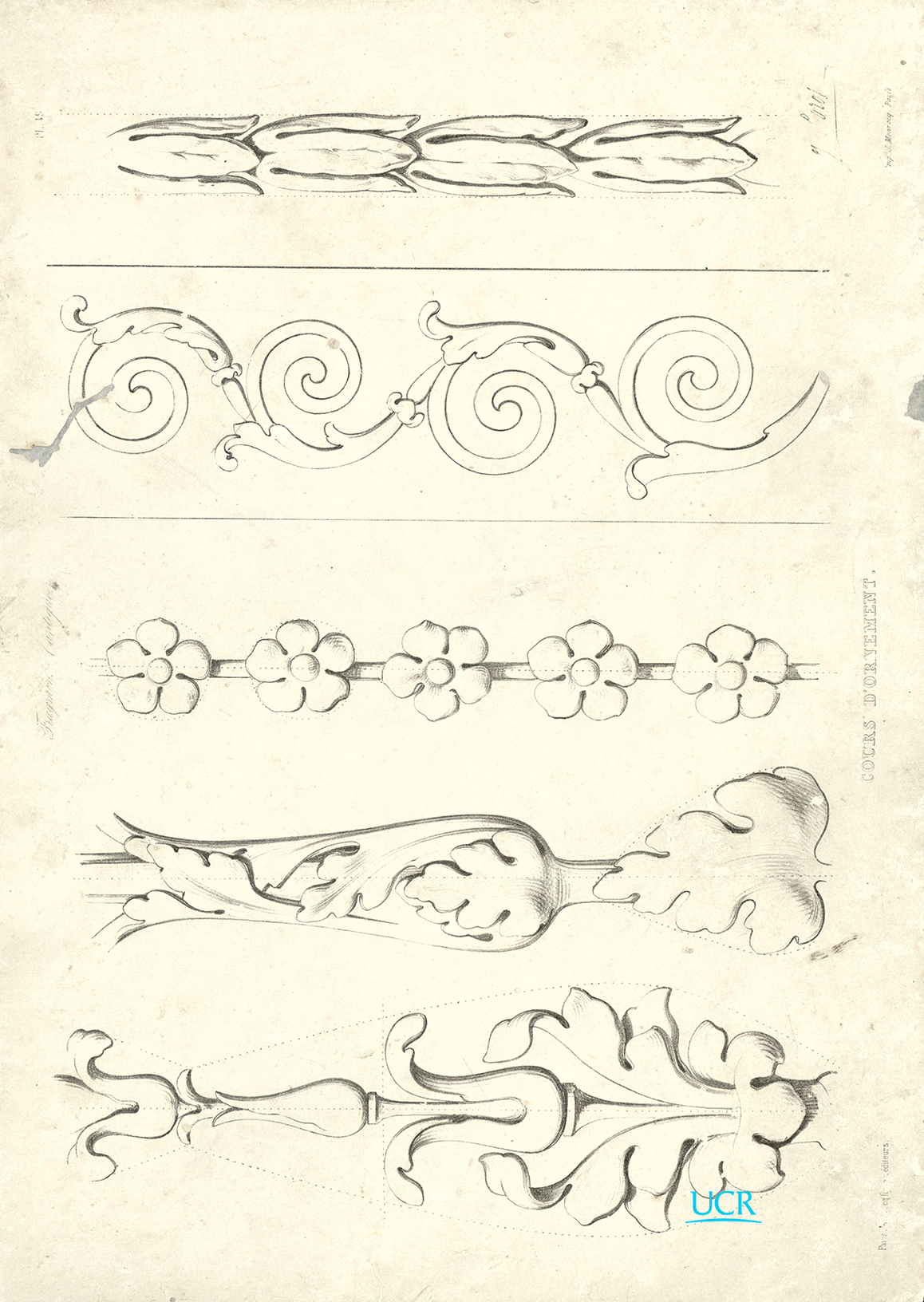 En esta colección de láminas se pueden encontrar principalmente dibujos de referencia para ornamentación arquitectónica.