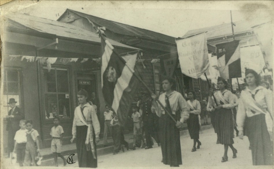 | dc.description.abstract | Desfile, fotografía de exterior, cinco estudiantes, al centro con el pabellón nacional, detrás de ella, alumna con el estandarte del quinto b "gupo Claudio Cortés" y detrás de este el estandarte del tercero a. Hay varios estandartes más, pero no se distingue a cuáles secciones pertenecen. | |