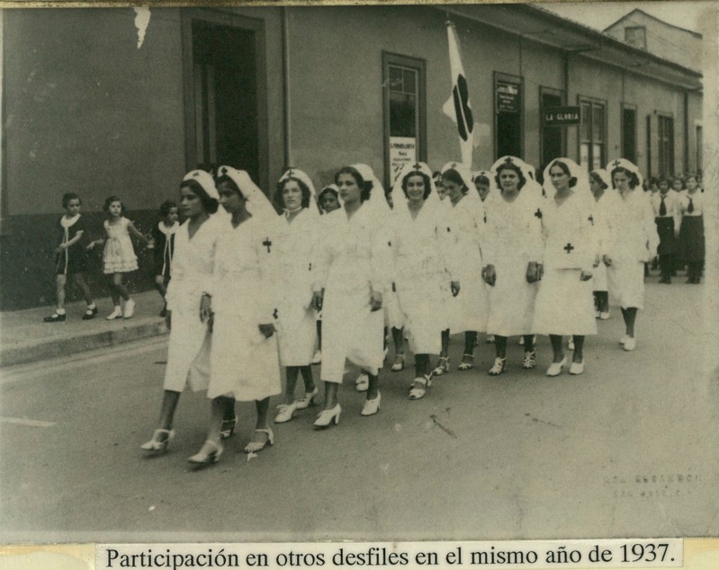 | dc.description.abstract | Fotografía grupal de exterior, desfile, en primer plano, alumnas vestidas de la Cruz Roja, atrás vestidas con uniforme a rayas. A la izquierda en la acera, se observan tres niños. | |